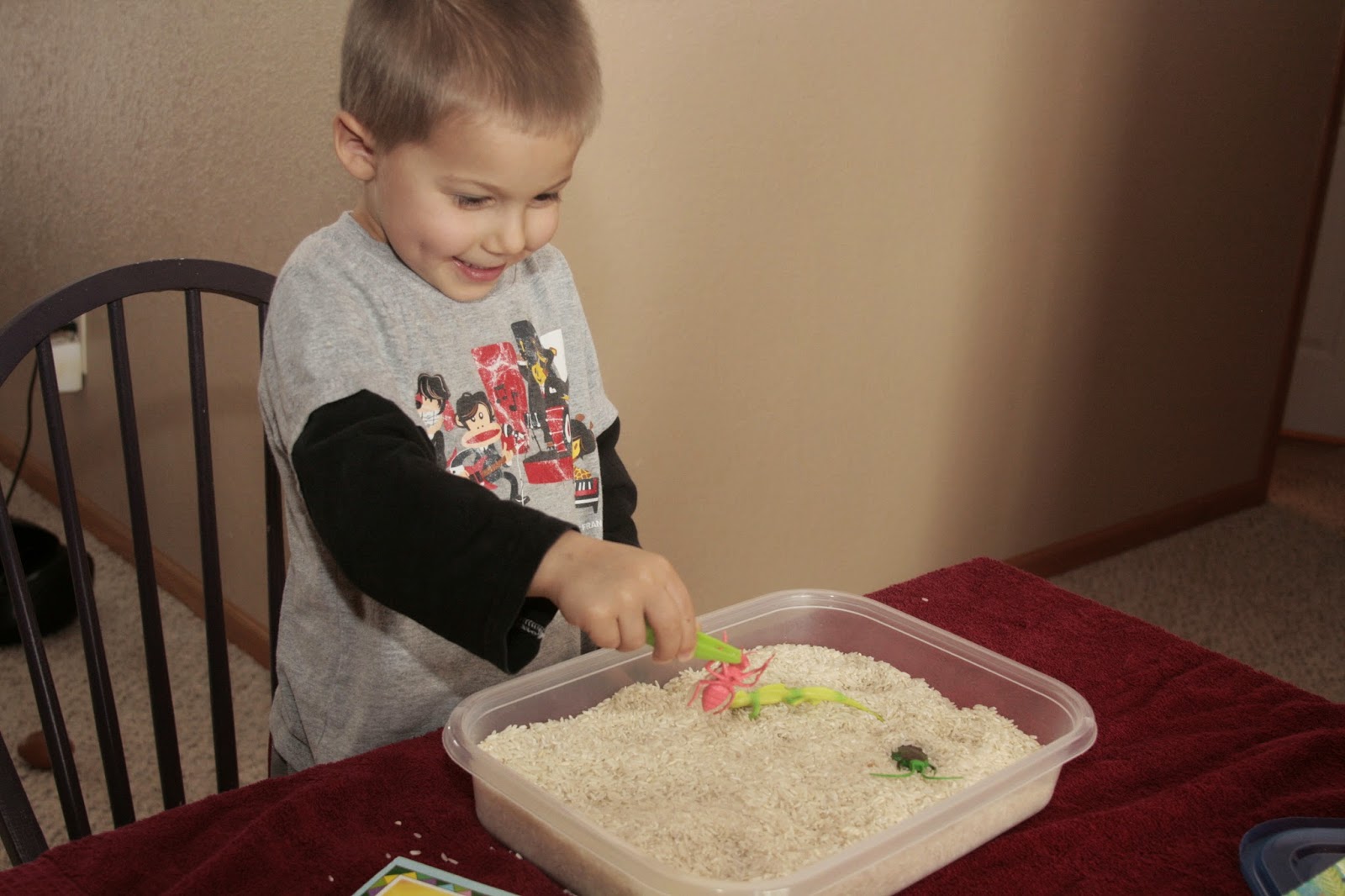 read books about insects, played with the fake insects in the rice bindid Ice Cube painting, (froze these out side which was fun to do) ha ha